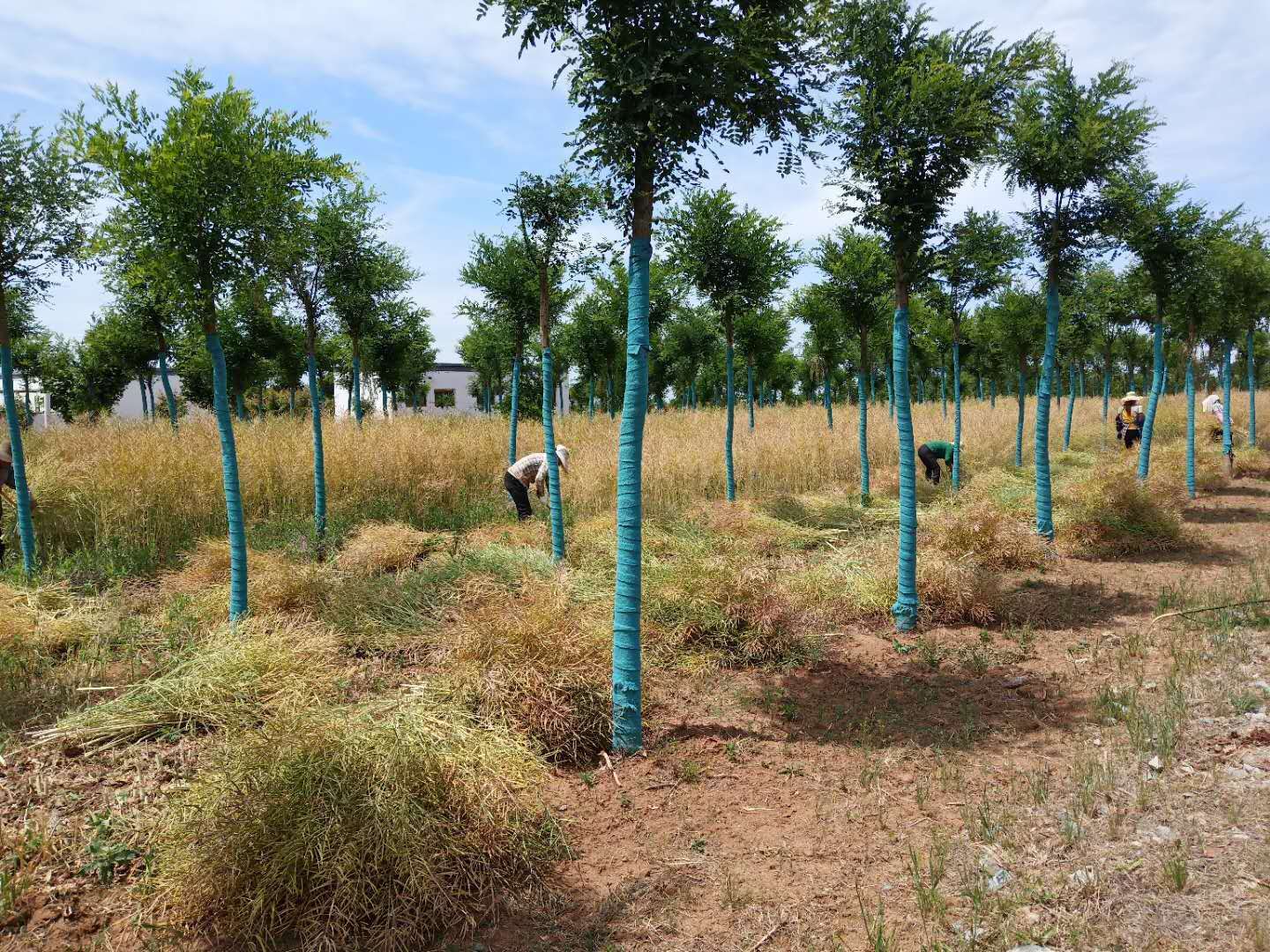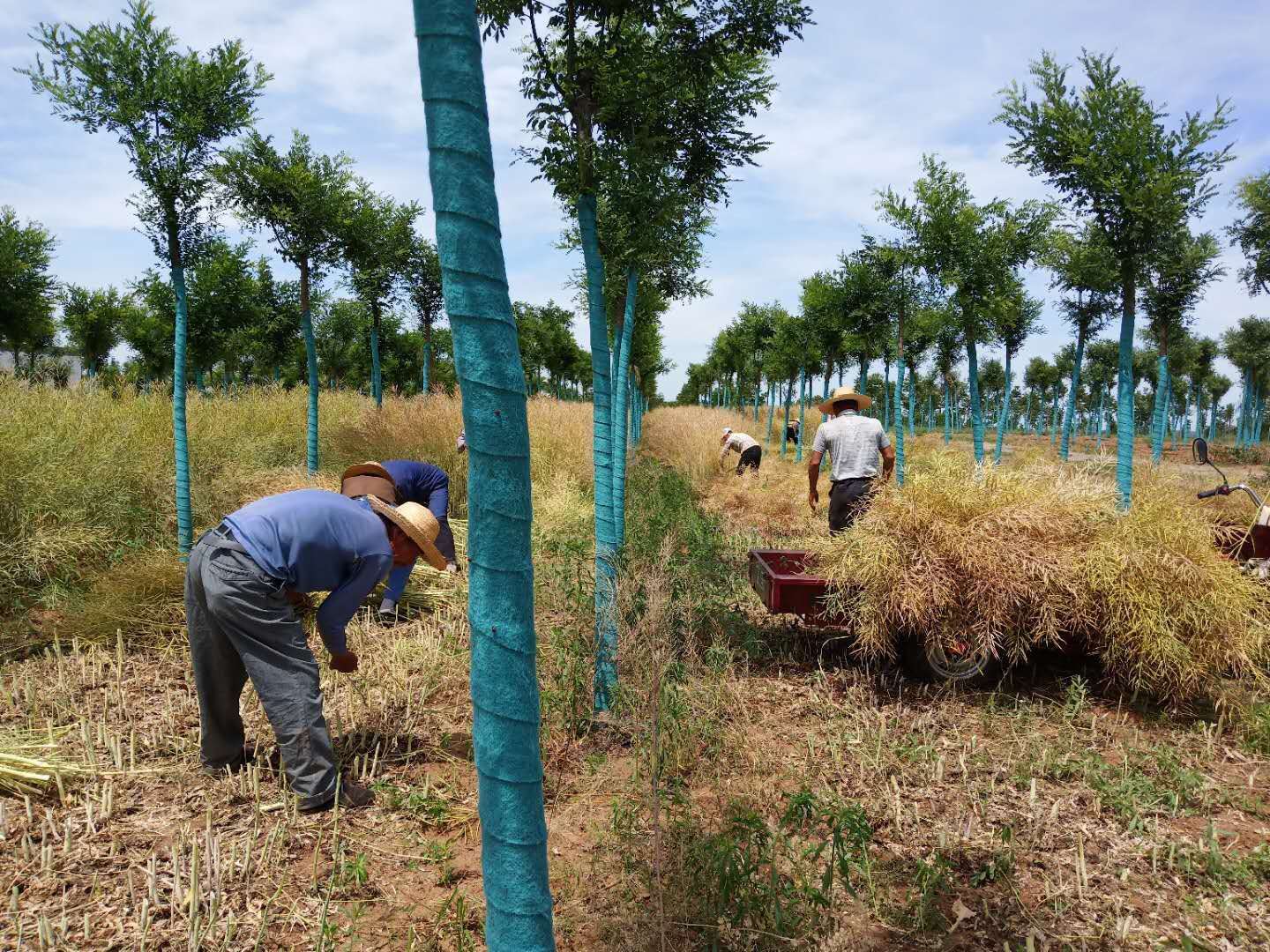 五月,仲夏時節(jié),夏花絢爛、果實飄香,位于藍(lán)田縣農(nóng)林產(chǎn)業(yè)扶貧基地的油菜花也進(jìn)入收割期。孕育了兩個月的油菜花結(jié)出了飽滿的花籽,讓春天里燦爛的花海被一片豐收繁忙的景象所替代:田間,經(jīng)發(fā)景觀工作人員有的在忙著收割、有的在晾曬油菜花,運輸農(nóng)資的車輛來回穿行……為苗圃增添了收獲的喜悅。