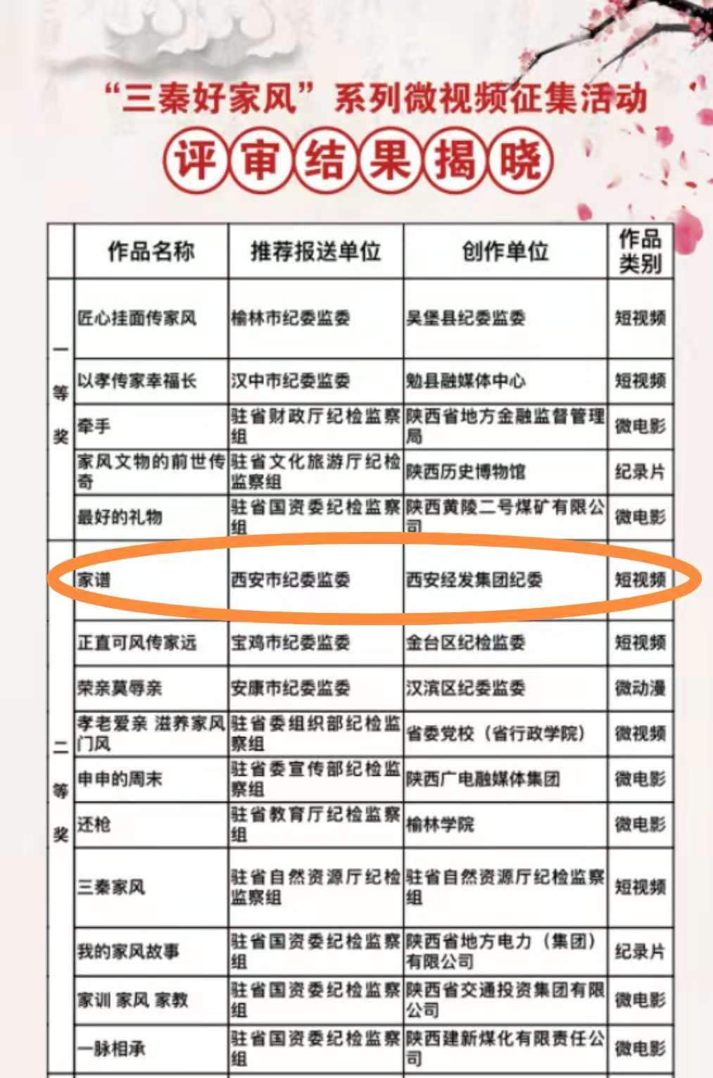 近日,秦風(fēng)網(wǎng)公布了陜西省紀委監(jiān)委組織開展的“三秦好家風(fēng)”系列微視頻征集展播活動評審結(jié)果,由西安市紀委監(jiān)委推薦報送,經(jīng)發(fā)集團紀委創(chuàng)作拍攝的微視頻《家譜》榮獲二等獎,這是繼《家譜》在2020年“崇廉尚德 好家風(fēng)潤西安”活動中獲獎后,再次斬獲省級獎項。